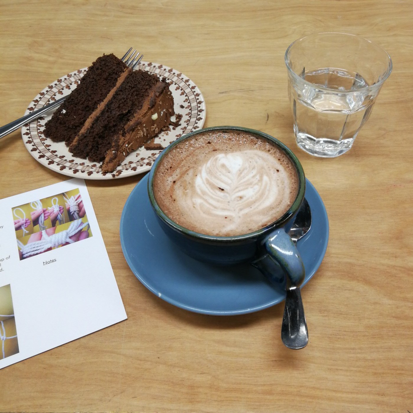 We arrived at the venue a little early, and noted a pottery class still going on upstairs. The lovely Debbie welcomed us and explained that we should get our cake and drinks whilst she set up. After ordering a huge slab of chocolate cake, we went upstairs to be greeted by 4 clothes rails with lots of string hanging from them. We settled down at the table behind the rails to be given a demo of the three (yes, only three) basic techniques for macrame – one forms a twist, another a square knot, and finally – my favourite – a diagonal line.