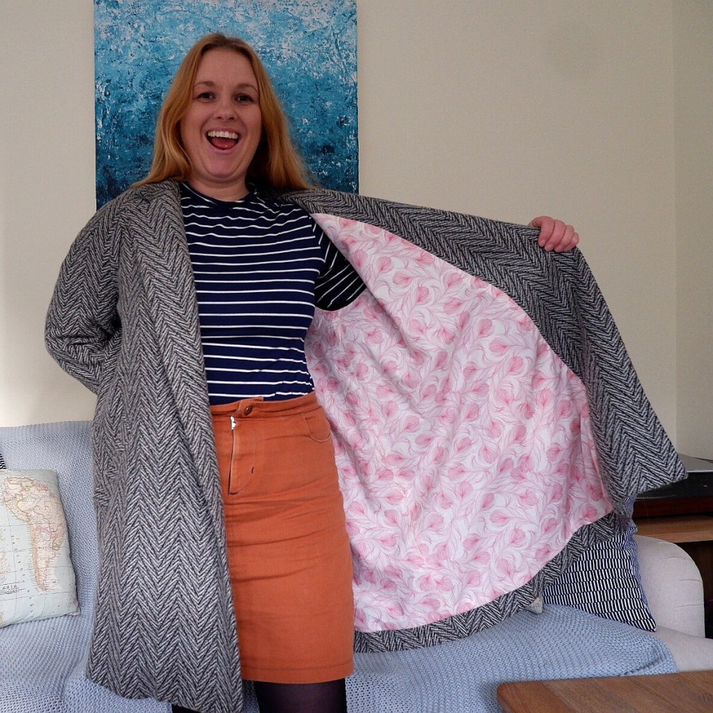 I used two fabrics for the lining. I wanted a fun contrast on the inside so opted for the white cotton with a pink floral print – it’s really pretty and pops so well against the grey and black of the wool. It’s been in my stash for a while and I had no plans for it so I was happy to use it so well. Although cotton can stick to tights, the swing design on this coat means that shouldn’t be a problem.