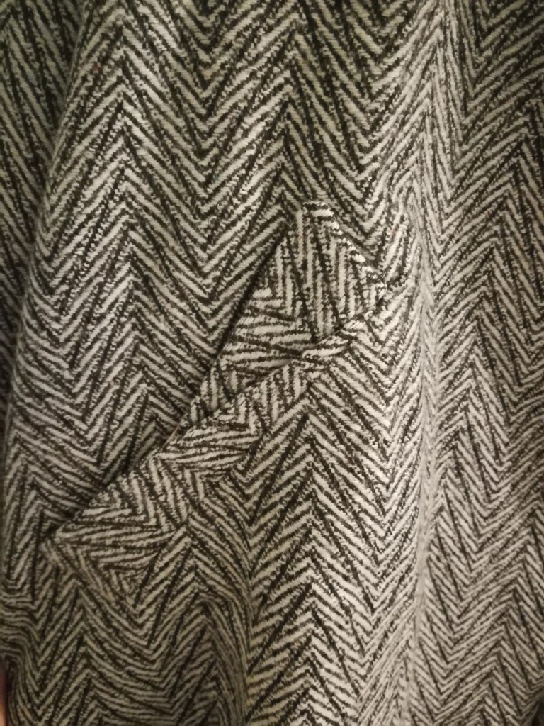 The pockets look level and the chevron points are level on different parts of the coat, so I’m very pleased. I had 4 yards of the fabric, and so still have quite a bit leftover…maybe one day Alba will get a matching coat.