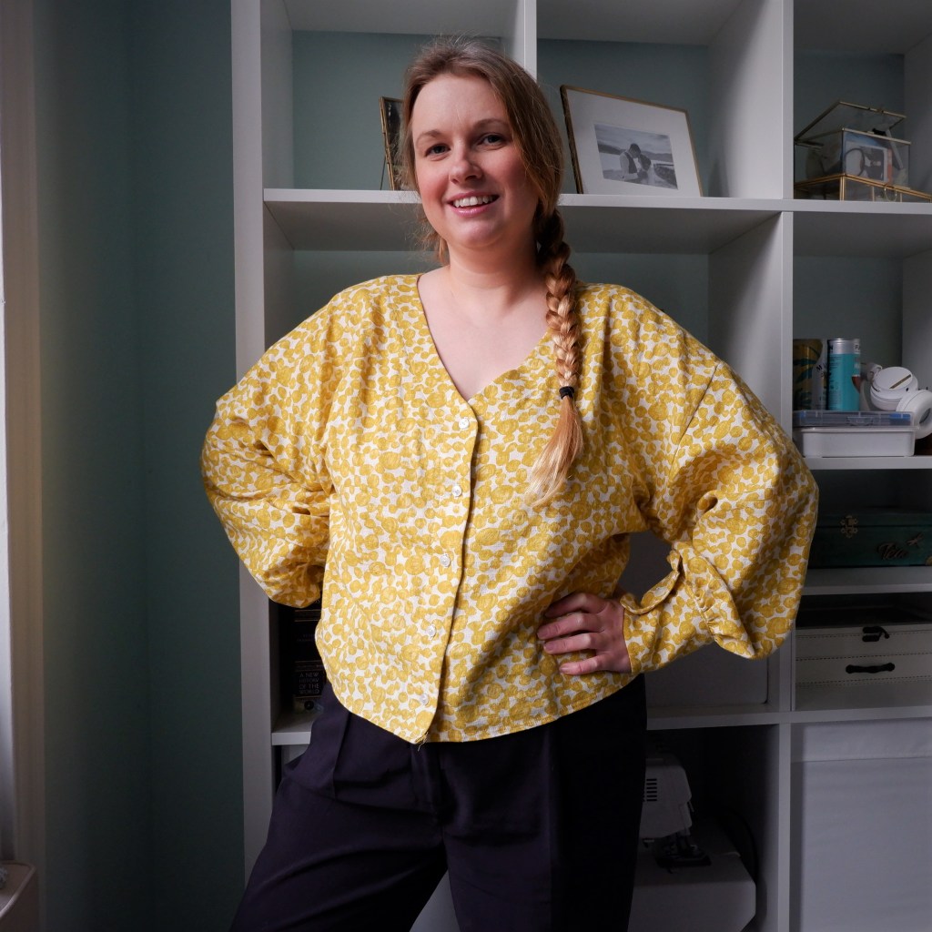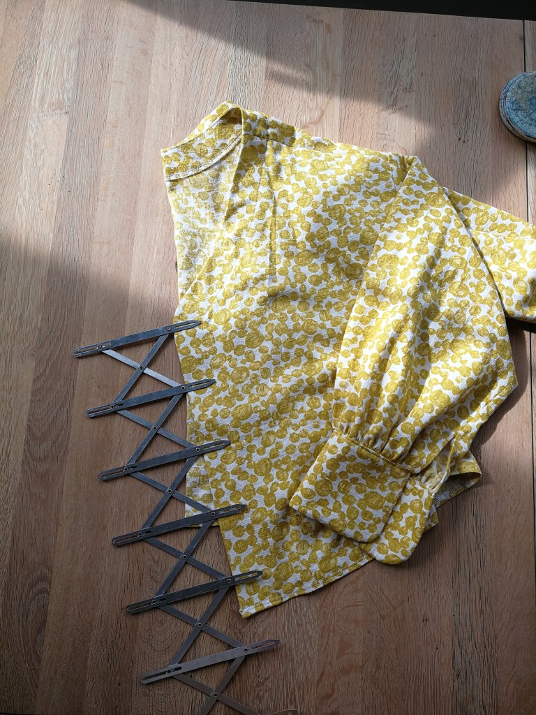 I was lucky to have the perfect fabric match for the blouse. I’ve had this beautiful gauze type cotton in my stash for a few years. It’s one of my most favourite pieces, and so while it was lockdown I decided to just go for it and finally use it. Although it’s super precious, it was also super cheap – I picked it up in the John Lewis sale, 3metres for £12.60. I know, almost robbery! And it’s Kokka which is a great brand too. I’m obsessed with yellow and I just adore the print, so was very excited to finally cut into it.