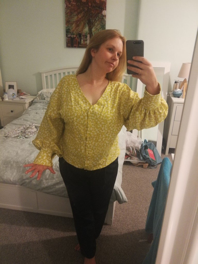 I made a mistake when choosing my size. I picked the size based on my bust measurement, when really what I should have done is based it on my high bust measurement because I have a 4inch difference between the two. I was so ready to go with the fabric that I didn’t toile and really should have done. After trying the blouse on I was a bit disappointed, as it gapes, but once I tried a few different hairstyles I decided I really liked it. It does gape if I lean forward, but it’s not been a problem with lockdown!